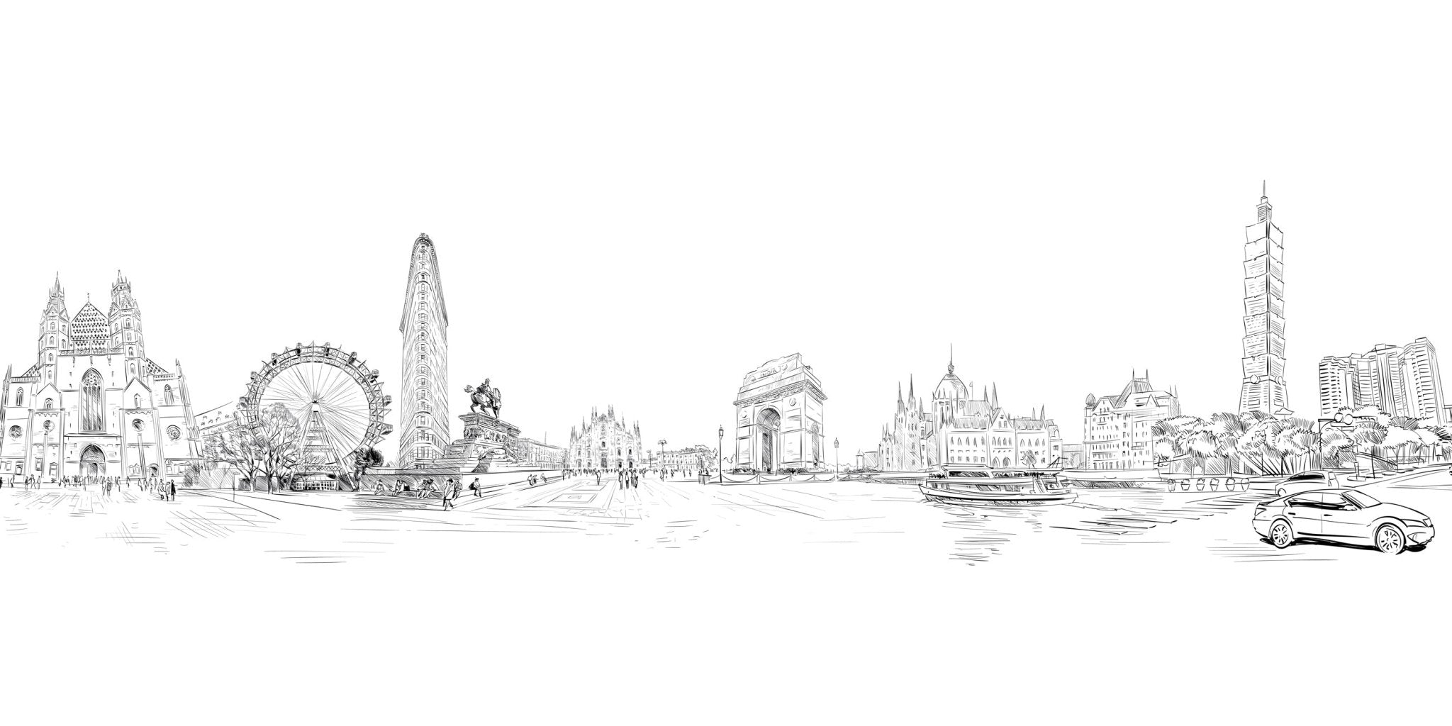 The monument of the world black and white wallpaper is a captivating work of art that captures the essence of the world's most iconic monuments in a uniquely designed style. The fine, detailed lines create an elegant, sophisticated contrast, ideal for contemporary interiors. Each monument, whether the Arc de Triomphe, the Colosseum or the Venice Canal, is depicted with artistic precision, bringing a touch of class and culture to any room. This bespoke panoramic wallpaper blends perfectly with modern furniture and minimalist decorations, adding visual depth without overloading the space. Perfect for a living room, office or bedroom, it transforms your wall into a window on the world, evoking dreams of travel and adventure. Transform your interior with class by installing our panoramic fresco.