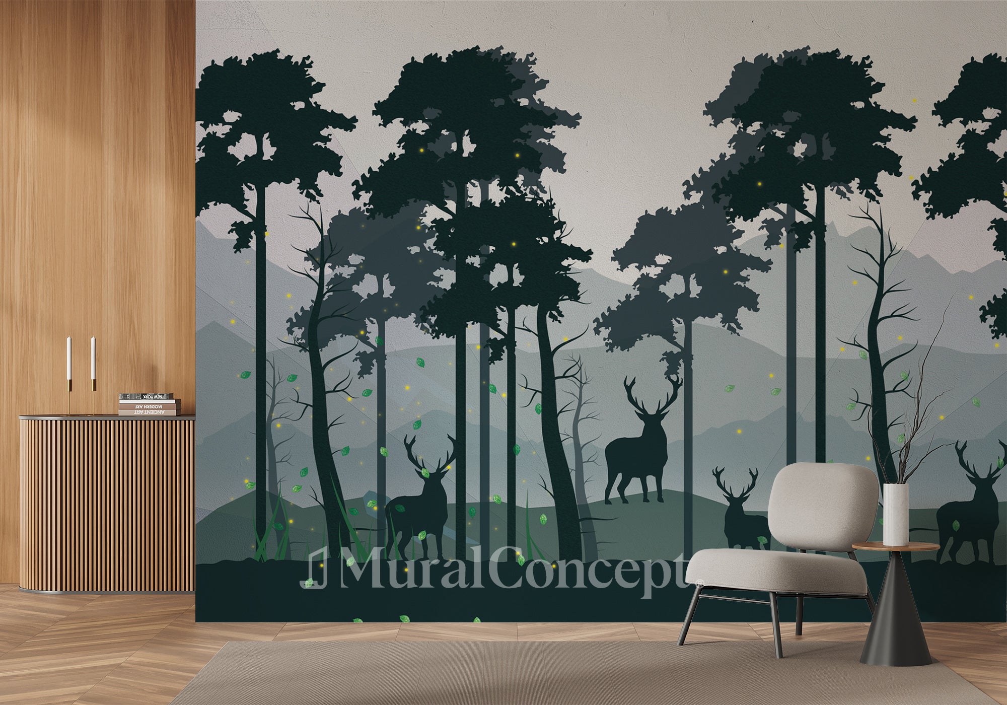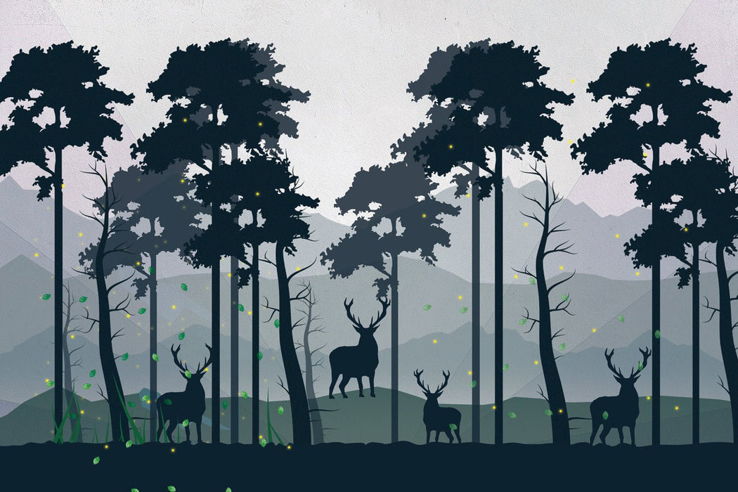 Un papier peint panoramique nature forêt cerf vert profond, inspirant et dépaysant. Cette fresque murale intissé aux couleurs verdoyantes profondes va amener de la nature dans votre intérieur. Ce revêtement mural XXL représente une peinture forêt, idéal dans un salon, dans une chambre, ou dans un bureau. Amenez de l'extérieur à votre intérieur, créer facilement un intérieur unique avec notre papier peint intissé réalisé sur mesure. Il est possible d'enlever les biches du décor mural sur simple demande par mail.