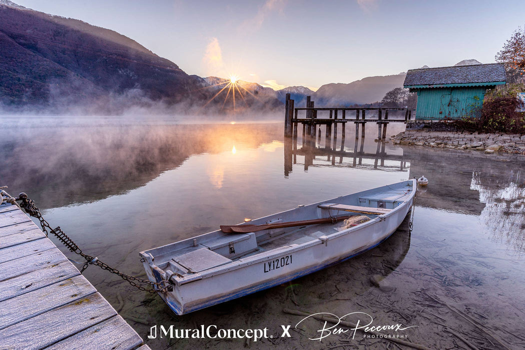 La représentation de ce levé du soleil, accompagné d'une barque solitaire qui flotte sur l'eau calme du lac d'Annecy, un ponton qui s'étend dans l'eau et une vue imprenable sur les majestueuses montagnes alpines. Le lac brumeux ajoute une touche de mystère et de calme à l'atmosphère de votre intérieur.