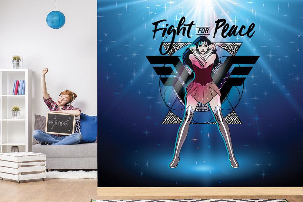 Notre papier peint panoramique WonderWoman héroïne position défense est tiré du célèbre dessin animé, vous apporte un univers scintillant et bleuté.