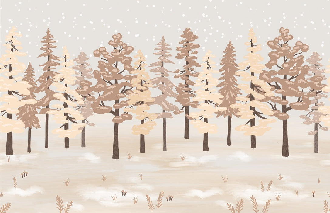 Snow-covered fir tree, pastel colors, this fairy-tale watercolor fir tree children's wallpaper takes us into a dream world. This mural-like wallpaper is artistic, magical and fairytale-like. The colors of this panoramic tapestry are soothing. Softness, tenderness and escapism.