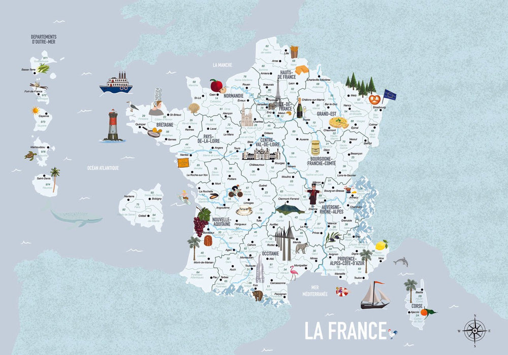 Découvrez notre papier peint carte de France enfant bleu. Cette carte de France permet aux petits et grands d'apprendre la géographie de la France facilement. Ce papier peint carte du monde illustré permet de connaître les spécialités des régions ou des départements. Un papier peint ludique, facile d'apprentissage et joliment illustré qui met en lumière toutes les richesses de la France : monuments, alimentation, montagnes, fleuves, département d'outres mer… Comment ne pas craquer pour cette fresque murale carte de France ? Ce décor panoramique est d'un style doux, scandinave, proposé en trois couleurs. Il est idéal pour créer une atmosphère relaxante, propice à l'endormissement, mais aussi bien pensé pour faciliter l'apprentissage et donner l'envie à toute la famille de découvrir les quatre coins de la France. Créez facilement une décoration unique avec ce papier peint sur mesure ! Comme nous sommes convaincus que vous allez l'adorer. Tous nos papiers peints sont Eco-friendly, Kids Friendly. Ils sont respectueux de l'environnement et des intérieurs. Posez ce papier peint panoramique carte de France dans la chambre de votre enfant, dans une salle de jeux ou encore dans une salle de classe ! Les enfants seront émerveillés.