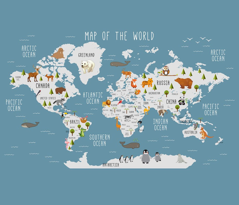 Papier peint fabriqué sur mesure, en France. Ce papier peint est une carte du monde éducative pour enfant en anglais.