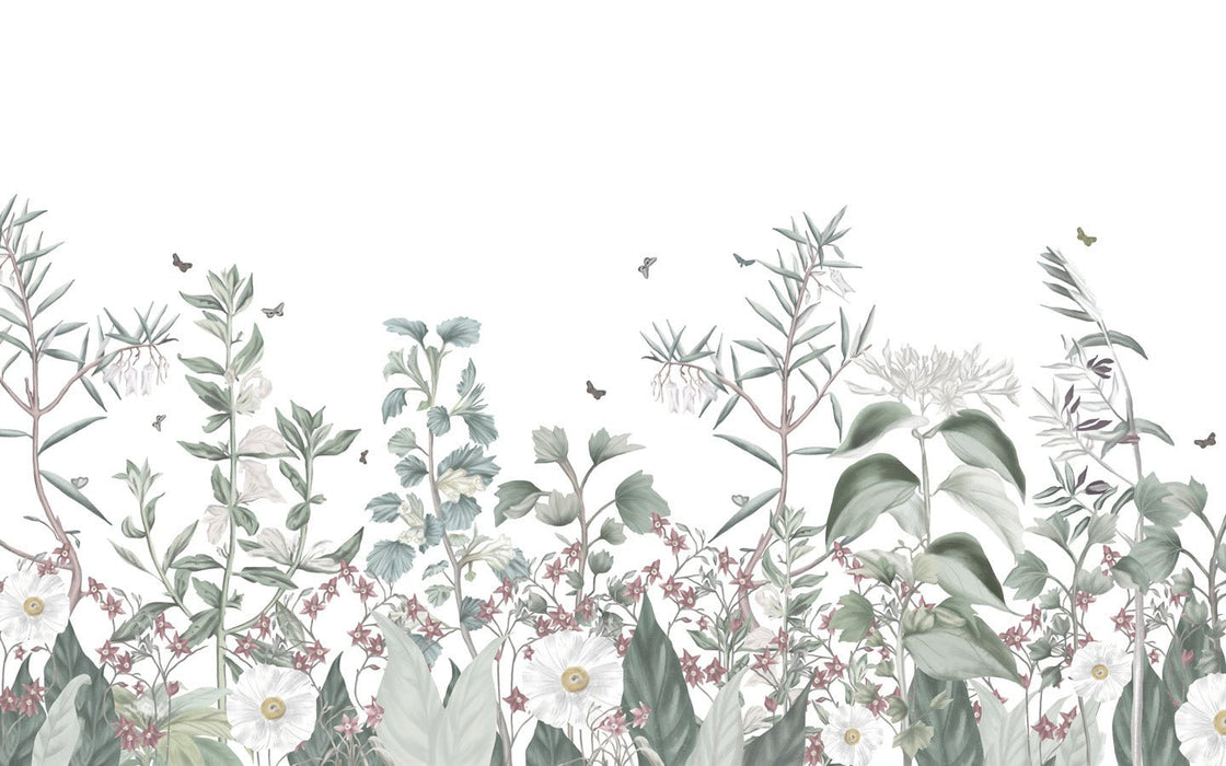 Discover our wildflowers wallpaper, a true panoramic mural that will bring a trendy touch to your interior. The soft, pastel colors, with shades of green and pink, create a cocooning, soft and romantic ambience in any room of your home.