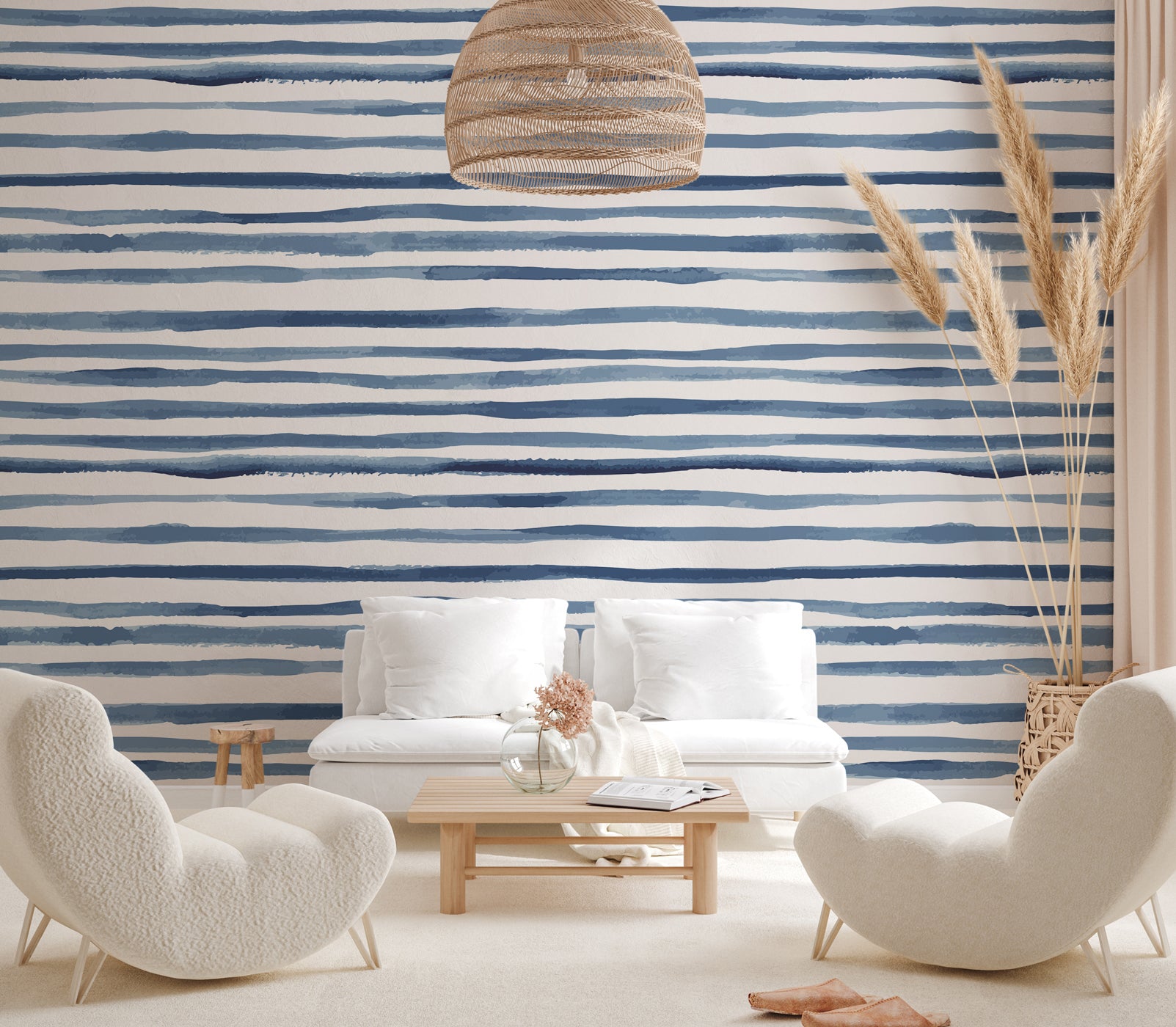 Le motif de ce papier peint sur mesure est inspiré des célèbres marinières, avec de longues lignes grossièrement peintes dans différents tons de bleu. Ces lignes évoquent les vagues de l'océan, ajoutant un dynamisme et une énergie à votre décor. Les nuances de bleu variées créent une profondeur visuelle, rappelant la beauté changeante de la mer.
