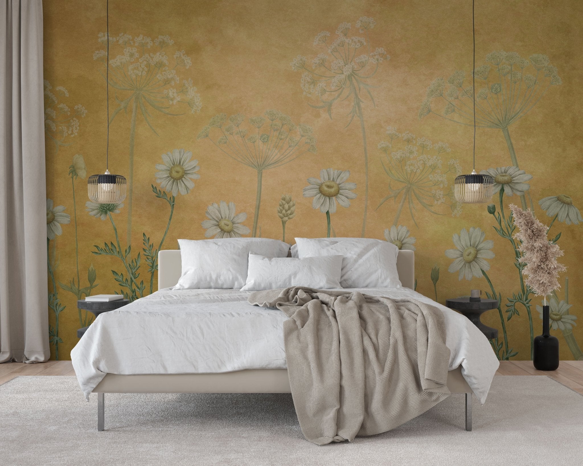 Le fond du papier peint, d'un jaune effet texturé, offre une dimension supplémentaire à votre mur. Sa texture subtile apporte de la profondeur et du relief, créant une atmosphère plus vivante et dynamique. Les marguerites se dressent fièrement, égayant votre espace de leur présence majestueuse.