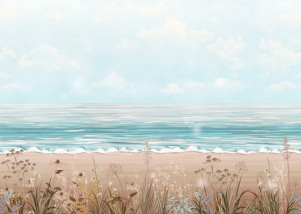 Découvrez notre magnifique papier peint panoramique vue sur mer, créé avec passion à l'aquarelle. Ce chef-d'œuvre artistique capture la beauté infinie de l'océan, du sable et des nuages, transportant votre intérieur vers des horizons lointains. Avec des touches délicates de fleurs sauvages qui ajoutent une touche de charme naturel, ce papier peint panoramique inspire l'évasion et invite à un voyage immersif.