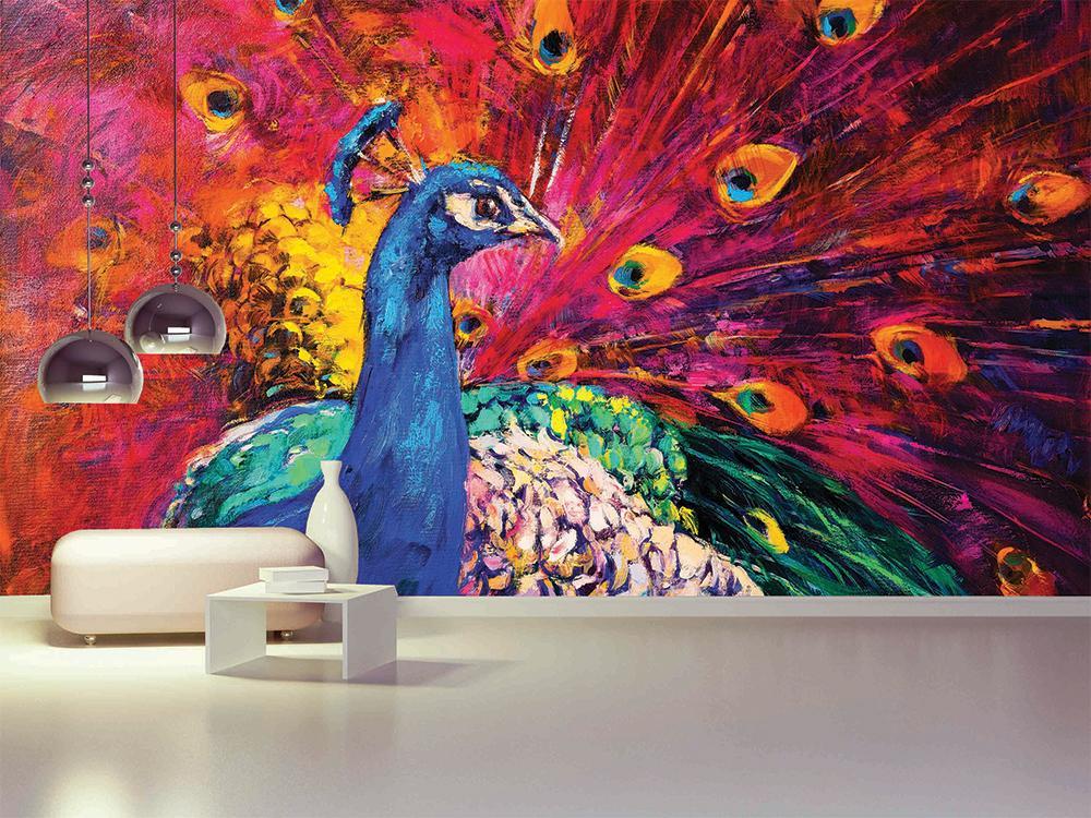 Admirez la majestueuse roue du paon rose à travers notre papier peint panoramique Paon rose peinture. L'originalité de ce décor aux couleurs éclatantes et rares de cet oiseau rose en pleine parade nuptiale impressionnera les fans de peinture et vos invités.
