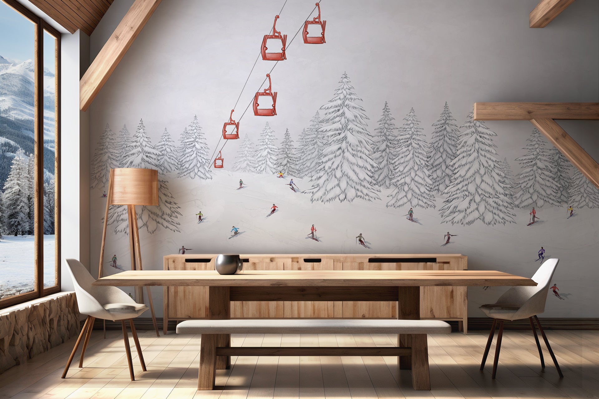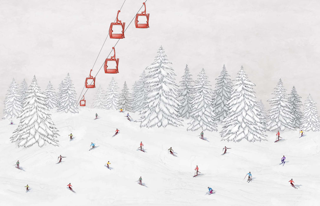 Ce design mural est composé de montagne, neige, et un léger ciel brumeux, avec des télécabines aux couleurs peps, et des skieurs comme on aime.