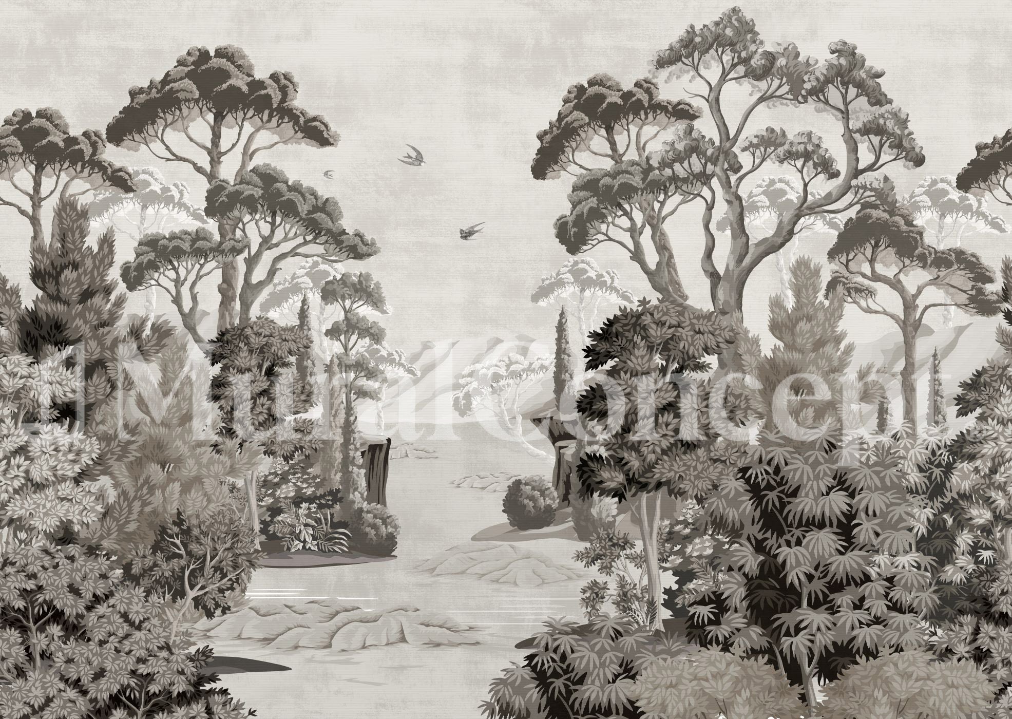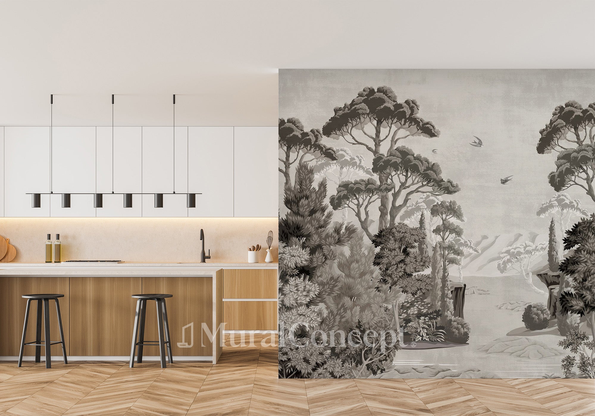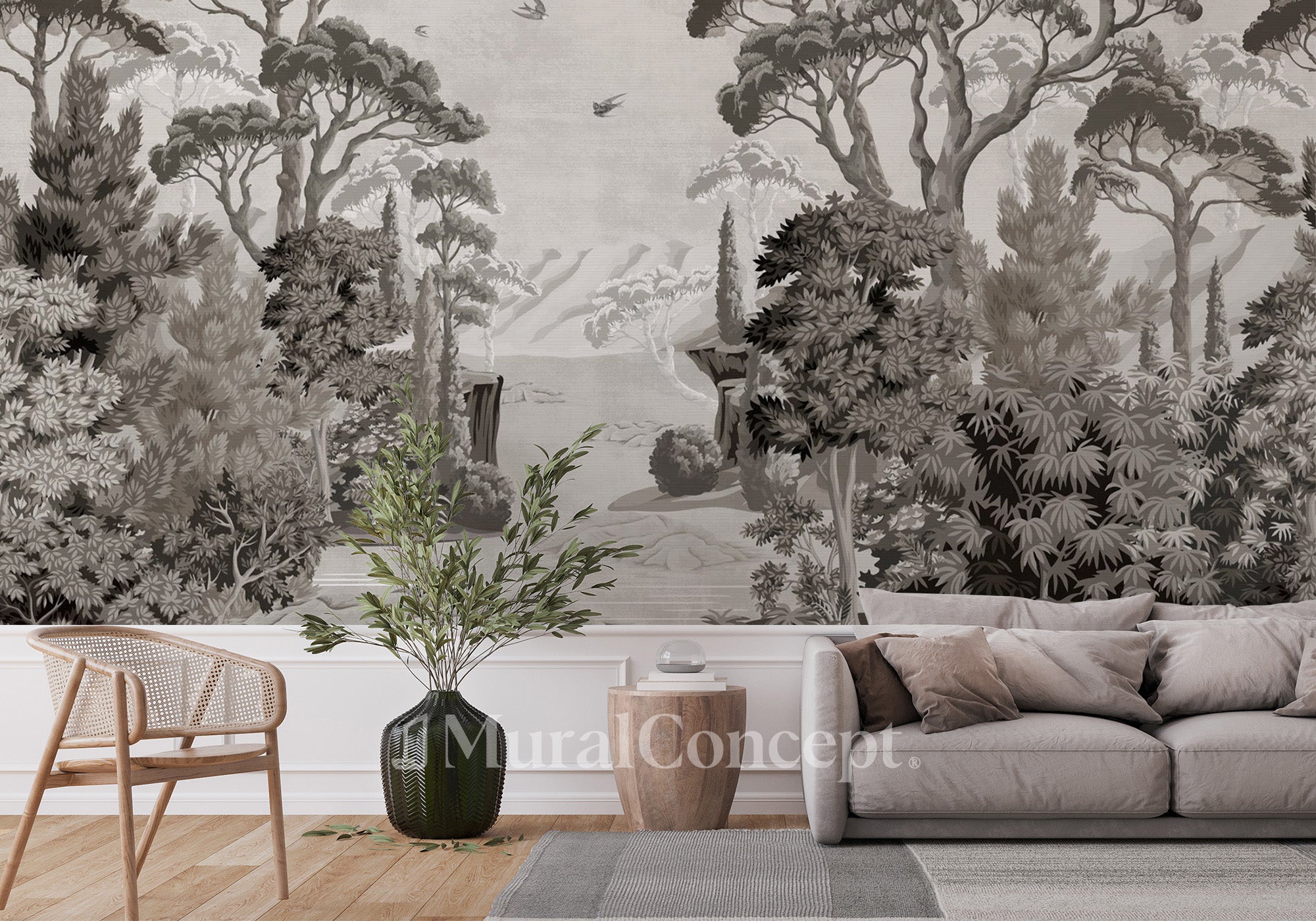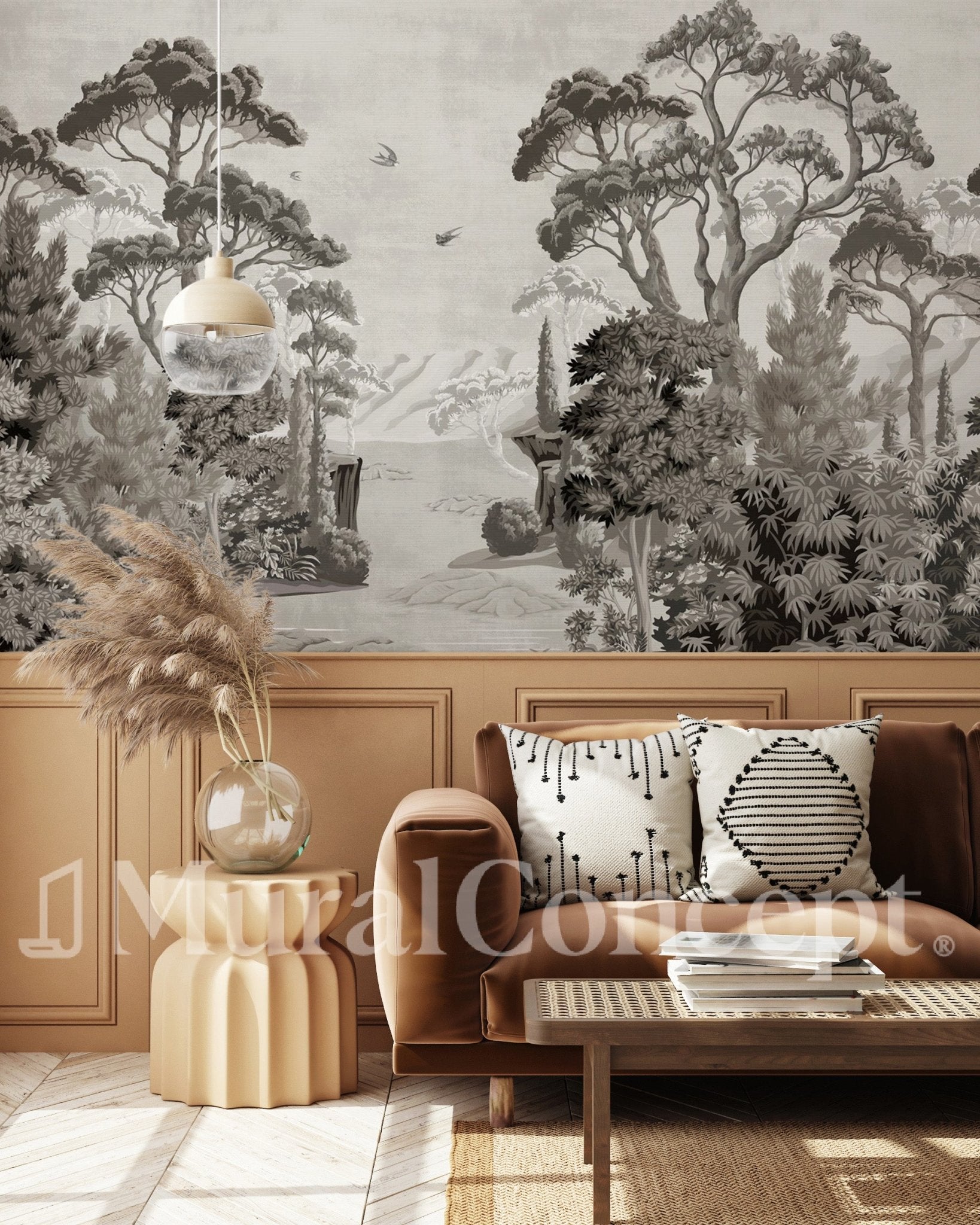 Un motif à l'aquarelle, peinture d'un paysage d'autrefois, ce papier peint panoramique va sublimer votre intérieur en apportant élégance et caractère. En monochrome pour apporter chic et raffinement à votre intérieur, le papier peint du style ancien est idéal dans les chambres, salons, et les entrées. Avec cette fresque murale sur mesure, vous allez créer intérieur chic. Cette fresque murale est une illustration retro revisitée et modernisée pour s'adapter au intérieur d'aujourd'hui en gardant une touche élégante d'autrefois. Le thème noir et blanc s'accorde parfaitement avec des objets déco bois, rotin, bambou, moulure haussmannienne.
